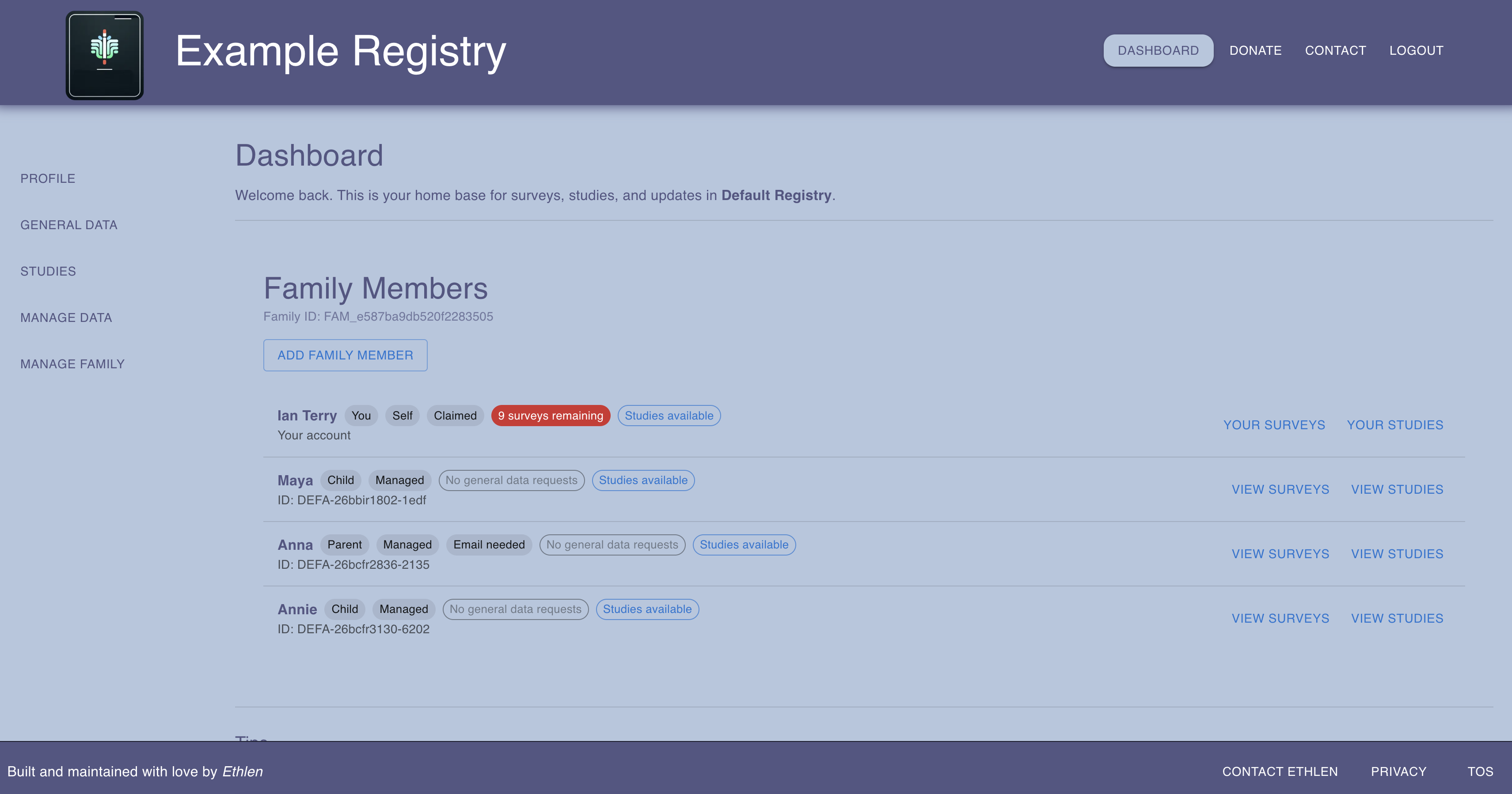 The participant dashboard — family management, survey tracking, and study enrollment in one place